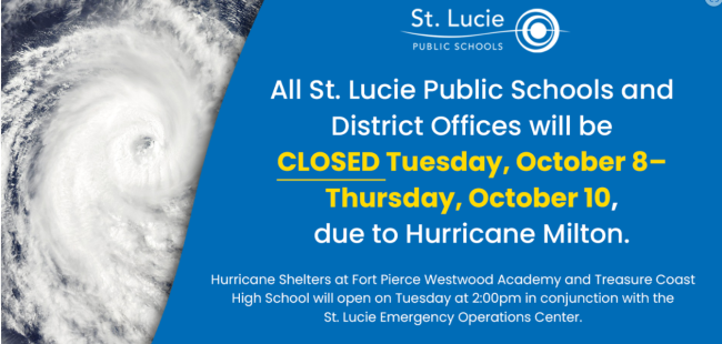 Update: Schools will reopen on 10/14/24 for teachers and staff, and 10/15/24 for students. Be safe! Good Afternoon, This is St. Lucie Public Schools Superintendent Dr. Jon Prince with an important announcement regarding Hurricane Milton. St. Lucie Public Schools will be closed on Tuesday, October 8th through Thursday, October 10th due to Hurricane Milton. Although…