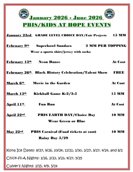 Check out our PBIS school-wide calendar for the rest of the 2025–2026 school year! We have many exciting events planned to recognize positive behavior and bring our school community together. Please save the dates, and thank you for your continued support as we celebrate our students all year long. We can’t wait to celebrate with you!